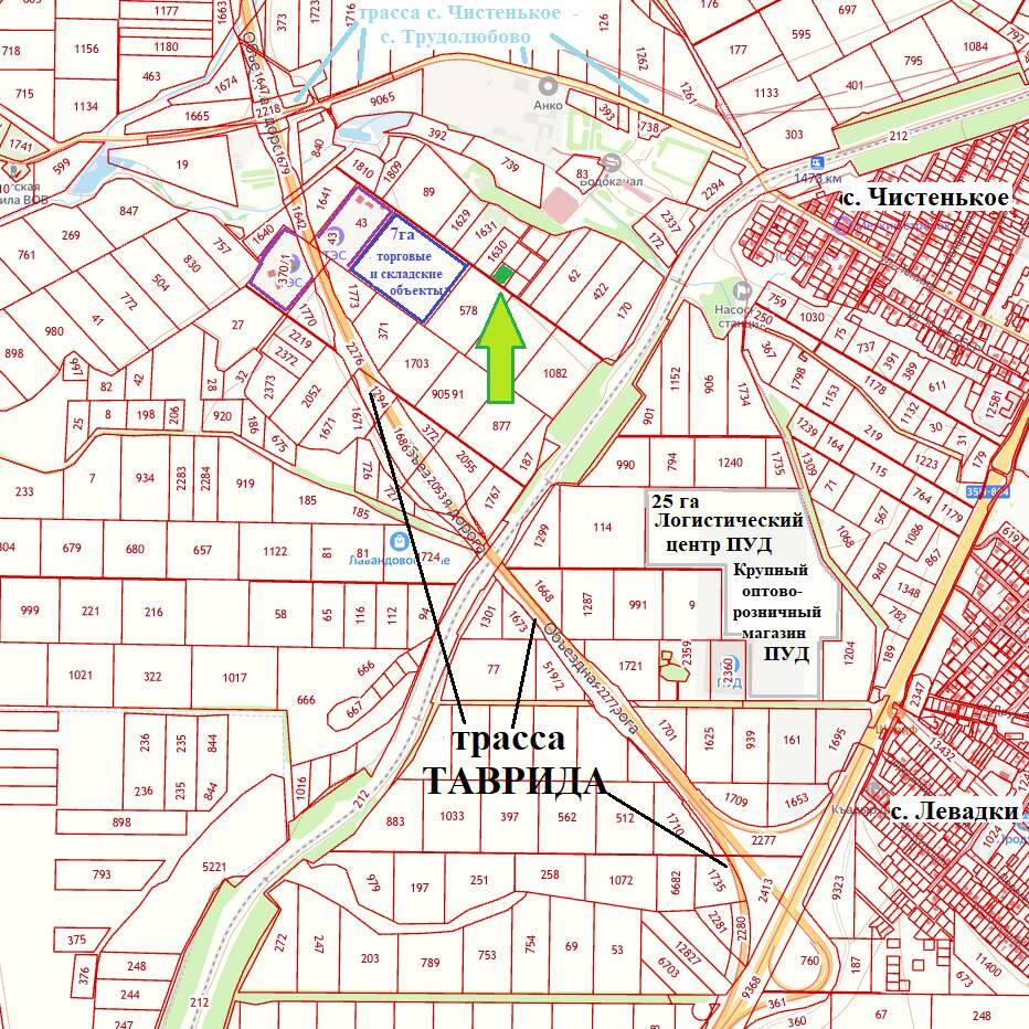 К участку имеется 2 автономных проезда по дорогам с официальными сервитутами: через заправку ТЭС на трассу/с трассы Таврида отдаленность от участка 350 метров (заключен договор); через дорогу прилегающую к трассе с. Чистенькое – с. Трудолюбово возле ЖД путей (400 метров).